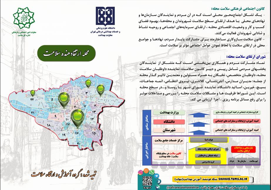 دکتر مصطفوی در ادامه گفت: ارکان اجرائی این برنامه در سطح محلات شامل هیئت‌امنای محله (در مرکز خدمات جامع سلامت)، کانون اجتماعی فرهنگی سلامت محله (در پایگاه سلامت / خانه بهداشت)، شورای ارتقاء سلامت محله، شبکه نخبگان محلی و گروه‌های مردمی سلامت‌محور هستند.
