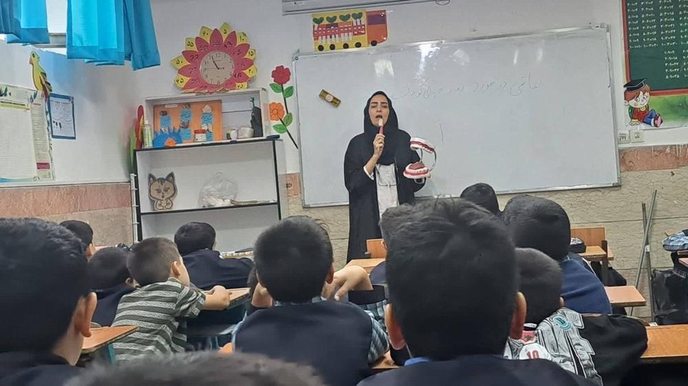 فاطمه فرجی، مراقب سلامت پایگاه شماره ۲ و ۳ مرکز خدمات جامع سلامت چهارده معصوم، نحوه‌ی صحیح مسواک زدن را به‌صورت عملی آموزش داد.